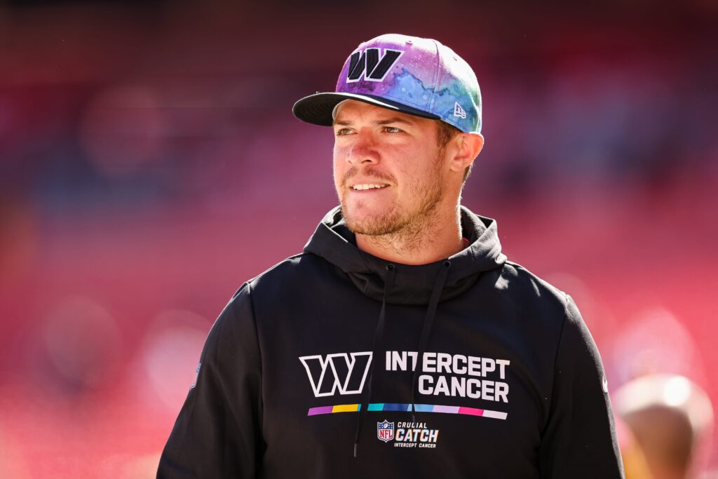 LANDOVER, MD – OCTOBER 09: Taylor Heinicke #4 of the Washington Commanders looks on before the game against the Tennessee Titans at FedExField on October 9, 2022 in Landover, Maryland. (Photo by Scott Taetsch/Getty Images)