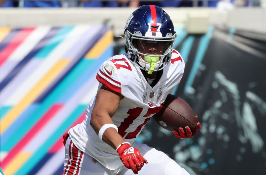 JACKSONVILLE, FLORIDA – OCTOBER 23: Wan’Dale Robinson #17 of the New York Giants runs the ball in the third quarter against the Jacksonville Jaguars at TIAA Bank Field on October 23, 2022 in Jacksonville, Florida. (Photo by Mike Carlson/Getty Images)