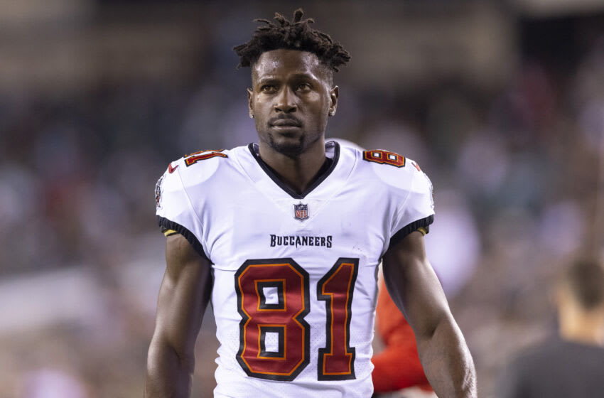 PHILADELPHIA, PA - OCTOBER 14: Antonio Brown #81 of the Tampa Bay Buccaneers looks on prior to the game against the Philadelphia Eagles at Lincoln Financial Field on October 14, 2021 in Philadelphia, Pennsylvania. (Photo by Mitchell Leff/Getty Images)