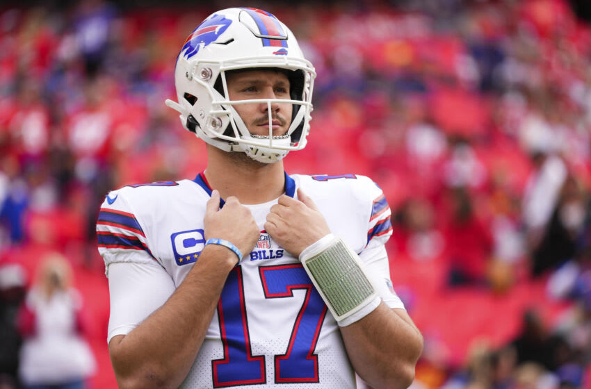 KANSAS CITY, MO - OCTOBER 16: Josh Allen #17 of the Buffalo Bills warms up against the Kansas City Chiefs at GEHA Field at Arrowhead Stadium on October 16, 2022 in Kansas City, Missouri. (Photo by Cooper Neill/Getty Images)