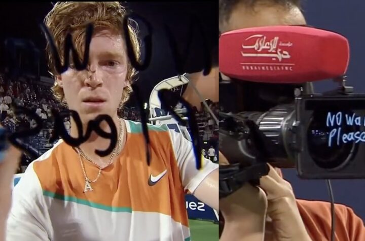 Russian tennis star Andrey Rublev wrote “No War Please” on a live television camera...