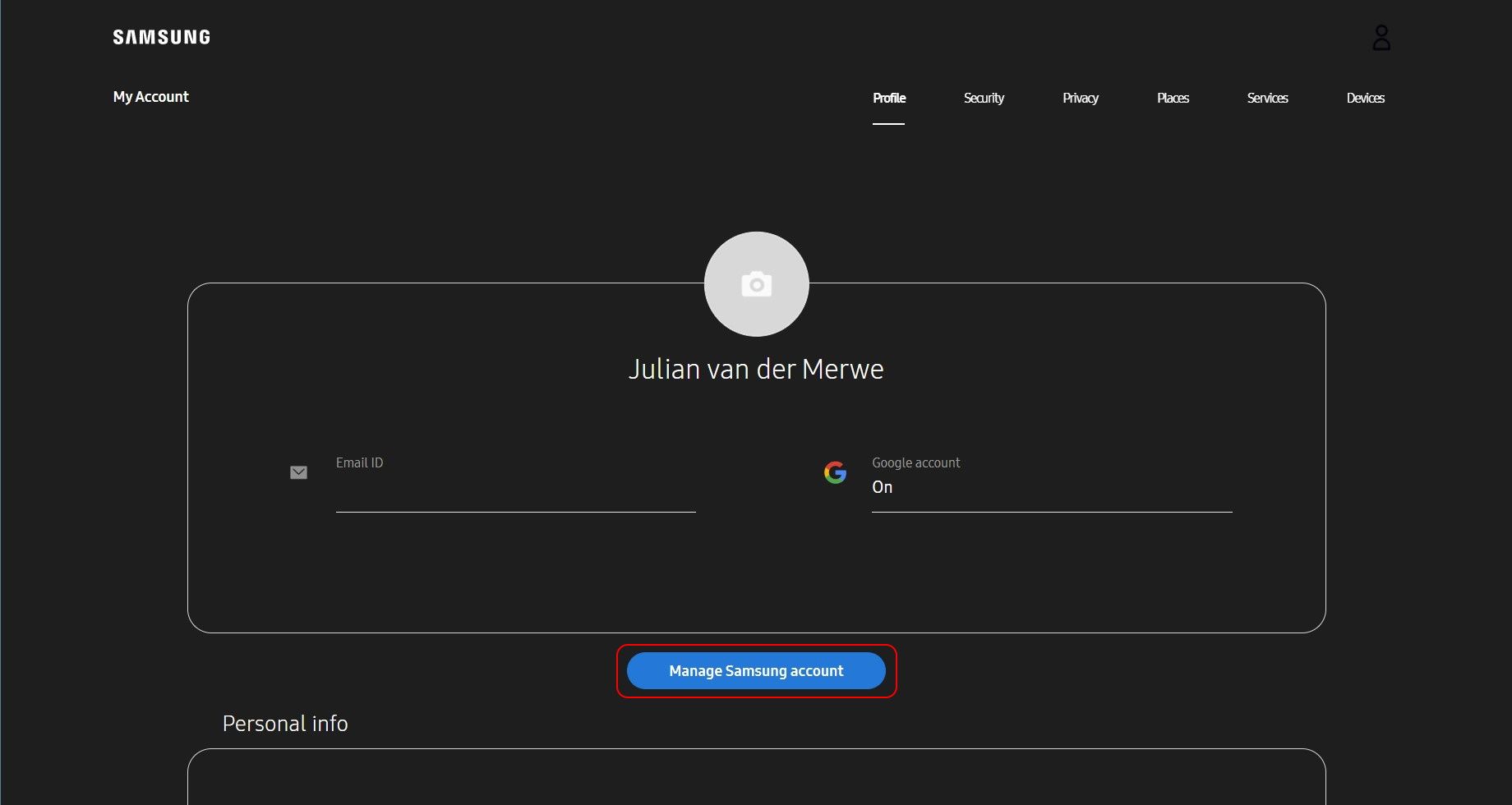- Click the Manage Samsung account button to go to the Samsung account settings page.