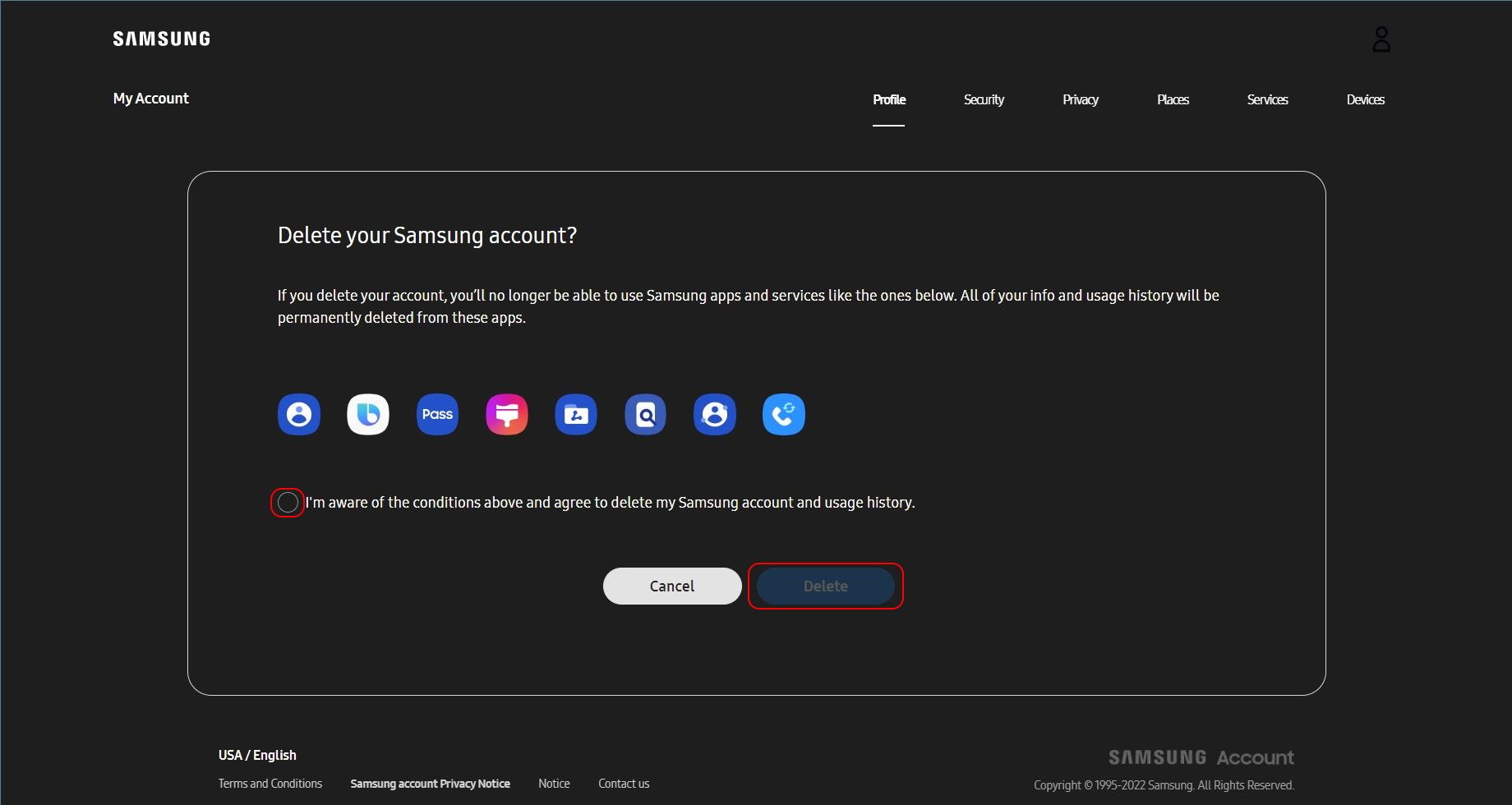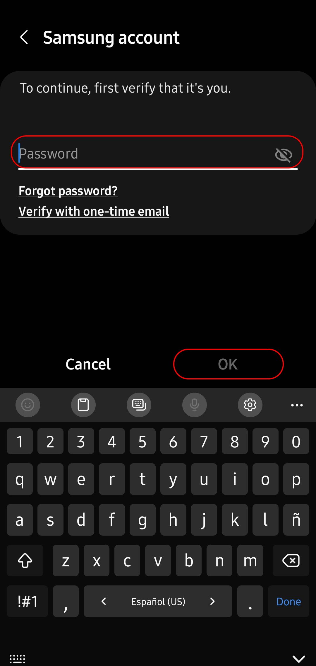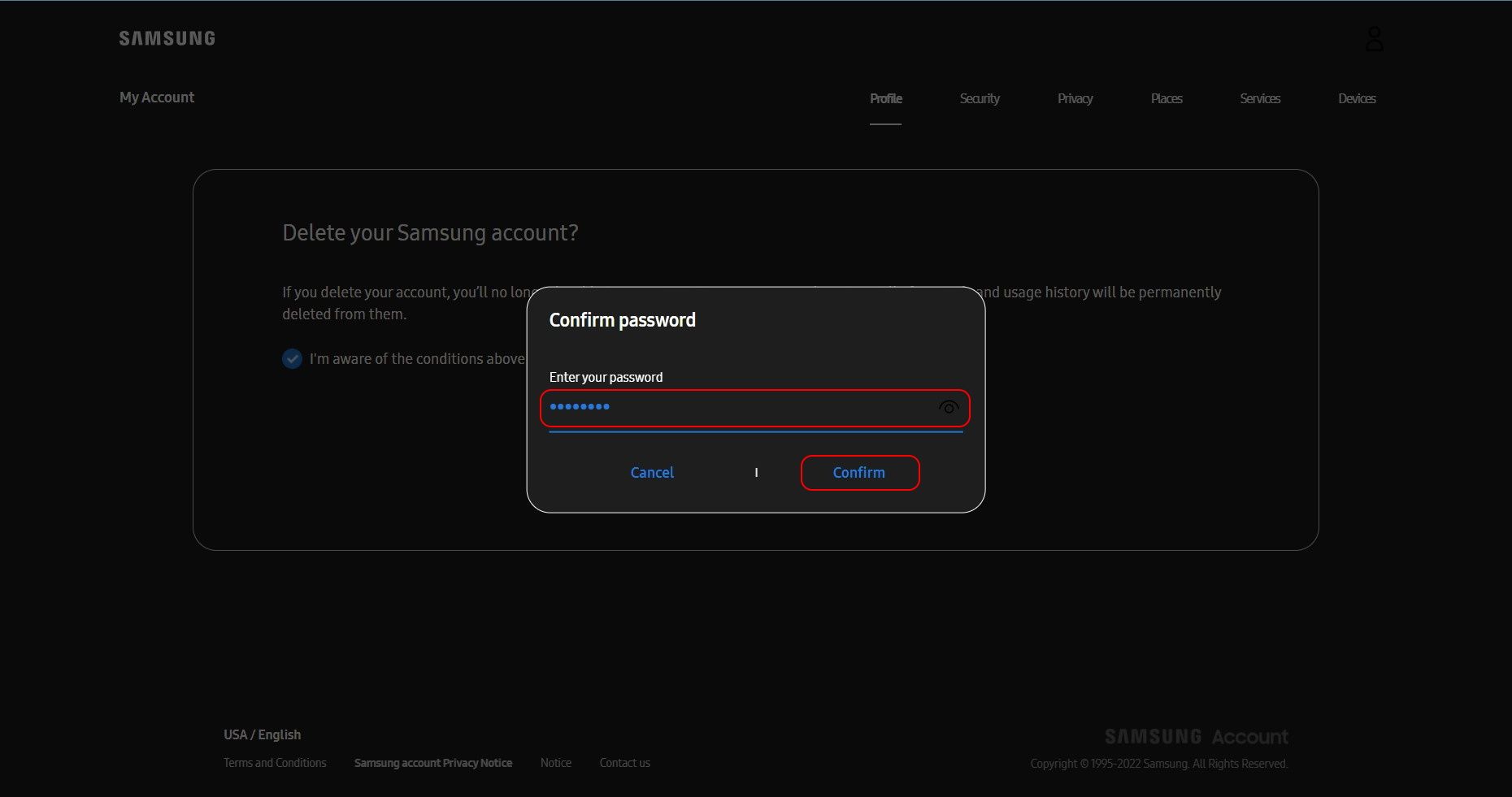 - In the authentication window, enter your Samsung account password and click Delete to confirm the deletion.