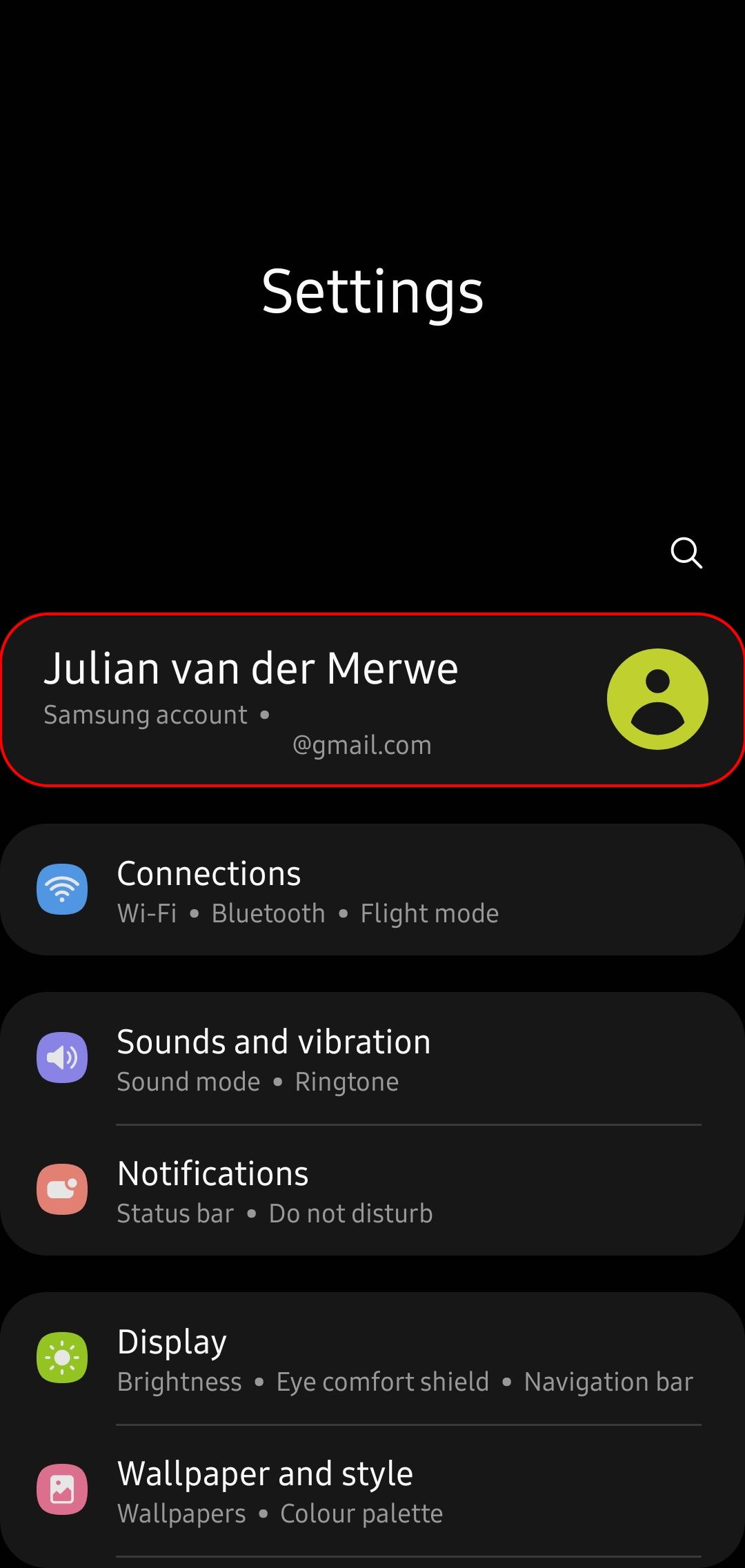 - Open Settings and tap the box with your name and profile picture at the top of the page to open the Samsung account settings page.