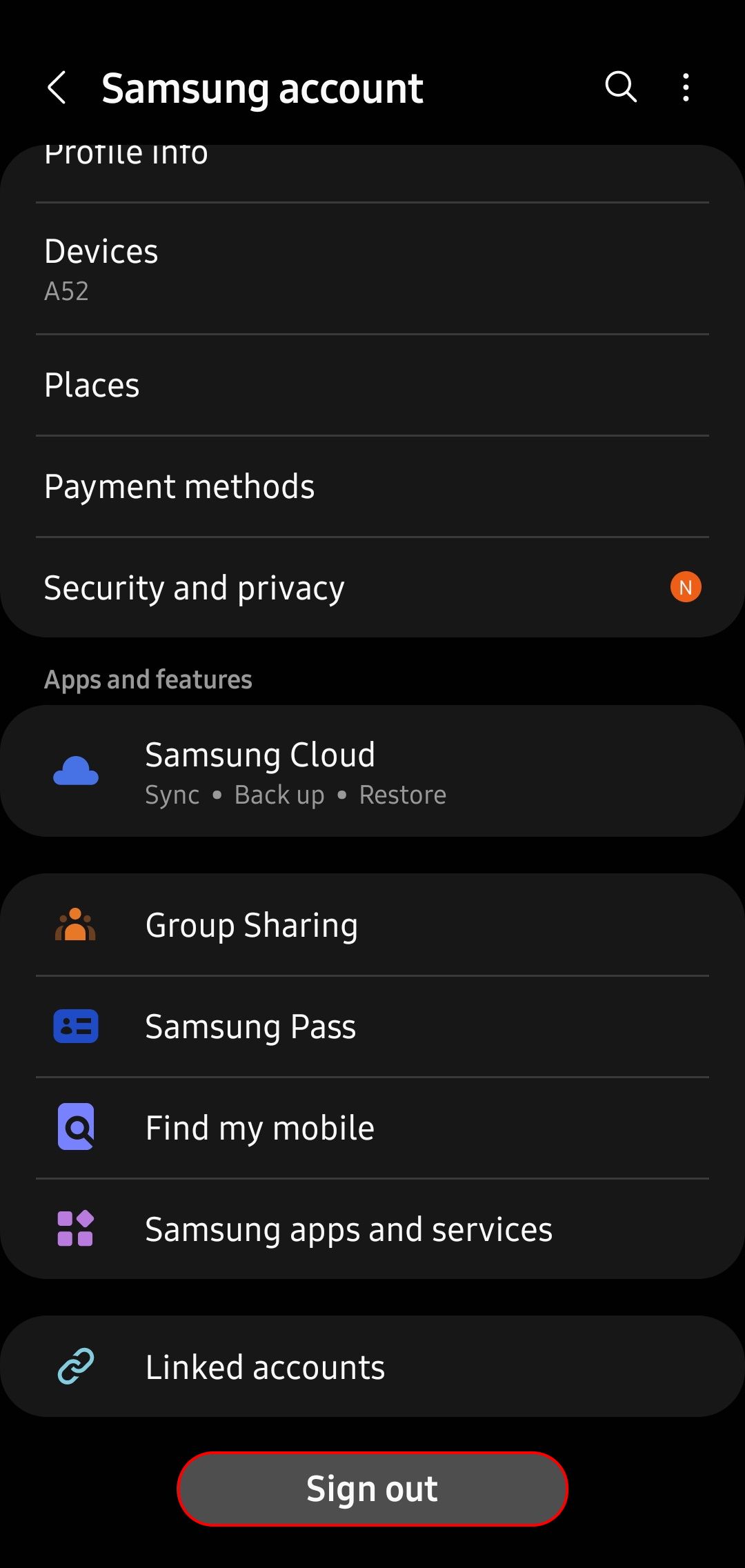 - Scroll down to the bottom of the menu and tap Sign out to start the account removal process.