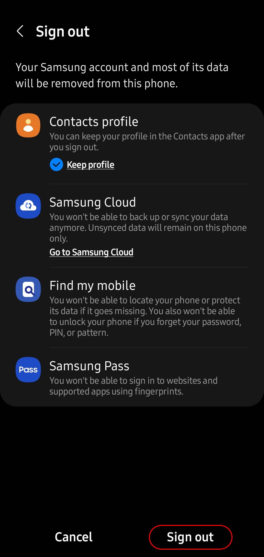 - After tapping the Sign out button, you will see a page detailing all the services you will lose access to. Scroll down and tap Sign out once more to go to the authentication and confirmation page.