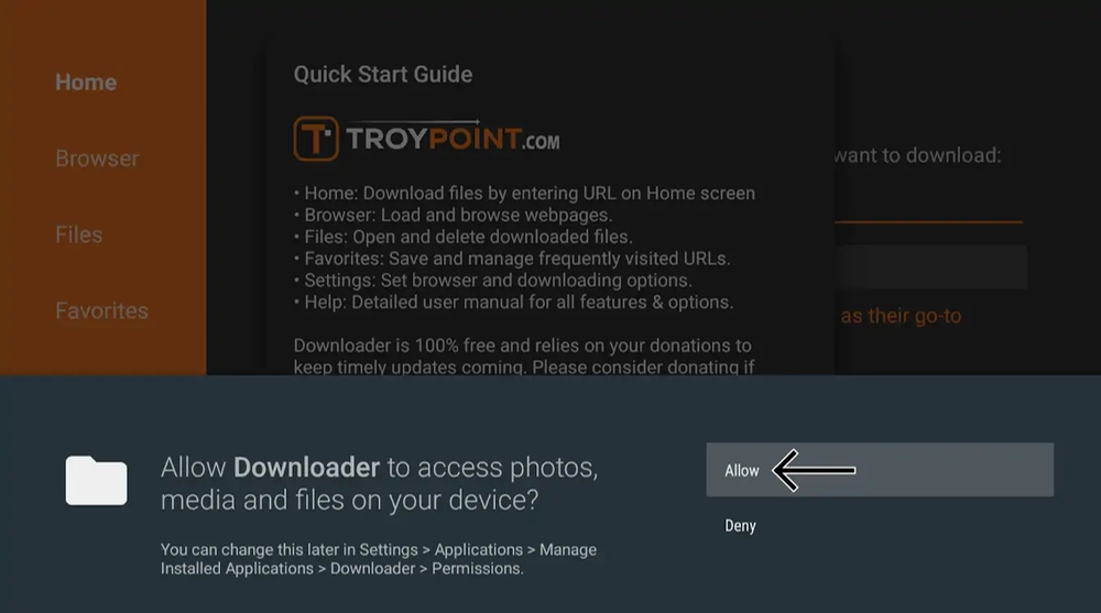 9. Open the Downloader app. Pick “Allow” when you open the app for the first time.