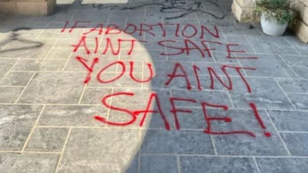 “If abortion ain’t safe, you ain’t safe,” red graffiti states on an entrance area of the Blue Ridge Pregnancy Center, photos posted by local police show.